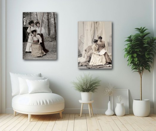 Le scannage permet l’agrandissement de l’image et la révélation de détails invisibles sur la photographie originale. L’impression du résultat en grand format, sur papier mat de haute qualité, nous offre ainsi l’opportunité d’une approche innovante de ces portraits, lesquels possèdent dès lors une touche moderne intemporelle et accrochent les regards.
